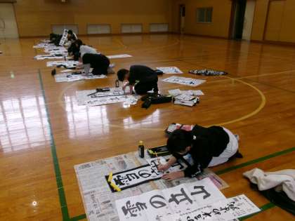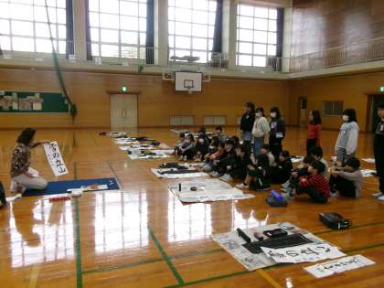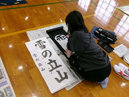 今日は体育館で書き初め教室を行いました。「雪の立山」を書くときのポイントを教えていただき、一つ一つ丁寧に書いている姿が見られます。