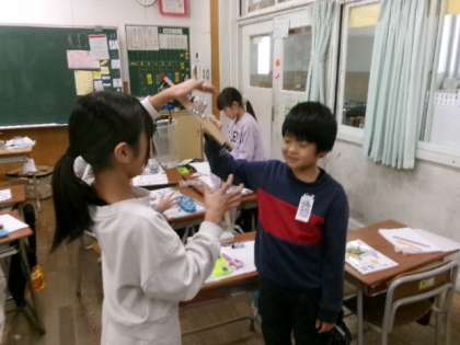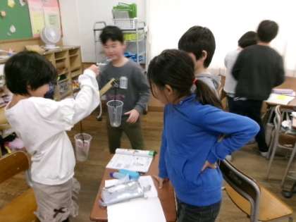 重さの学習で、てんびんを使って身の周りのものの重さを比べました。材料が異なるものでもつりあったり、見た目では分からないものでも違いが分かったりして、発見がありました。