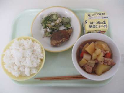 12月5日(木) 今日の給食 公開日 2024/12/05 更新日 2024/12/05 給食室から 今日は学校究極有機の日で、ご飯には有機米が使用されました。その他に、豚肉とじゃがいもの南蛮煮 揚げ魚のみぞれだれ ゆかり和え 牛乳 でした。