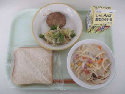 今日の献立は、 減量食パン クリームスパゲティ 鶏つくね 切り干し大根のサラダ 牛乳 でした。