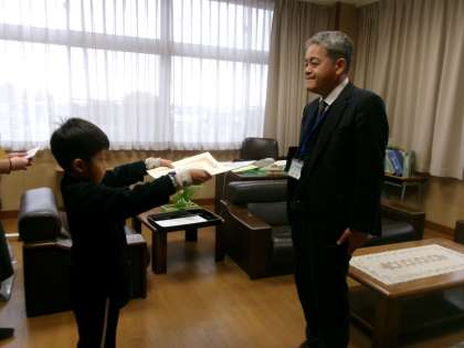本日は校長室にて授賞式が行われました。参加した児童は、真剣な表情で賞状を受け取っていました。