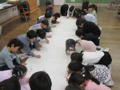 とても長い紙に絵を描くので、みんな夢中で描いていました。