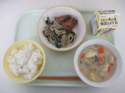 今日の献立は、ご飯 呉汁 魚の香り揚げ しょうがひたし 牛乳 でした。