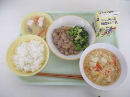 今日の献立は、 ご飯 豚肉のジャンロー かきたま汁 ゆでブロッコリー 牛乳 でした。