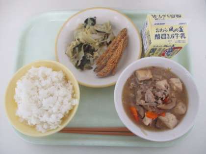 今日の献立は、ご飯 厚揚げの中華煮込み きびなごのさくさく揚げ 海藻サラダ 牛乳 でした。
