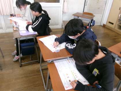 算数科では、「並び方と組み合わせ方」の学習をしています。分からない問題について友達と相談しながら進めていました。