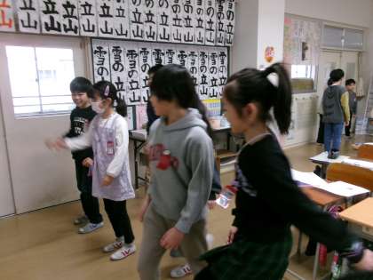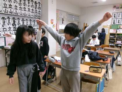 休み時間には体育のダンスをチームで練習している様子が見られます。発表会に向けて、それぞれ助け合っています。