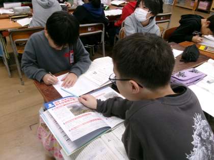 国語では、「もしものときにそなえよう」の学習をしています。富山県で起こりうる自然災害について調べ、日頃からどんなそなえをしておけばよいか本で調べています。