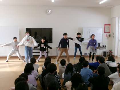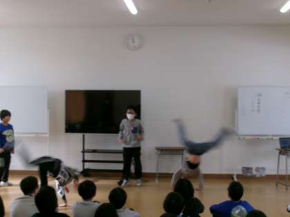 体育で練習してきたダンスの発表会をしました。各チーム工夫を凝らした創作ダンスばかりで、見ている人たちからは自然と手拍子が聞こえてきました。