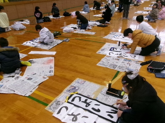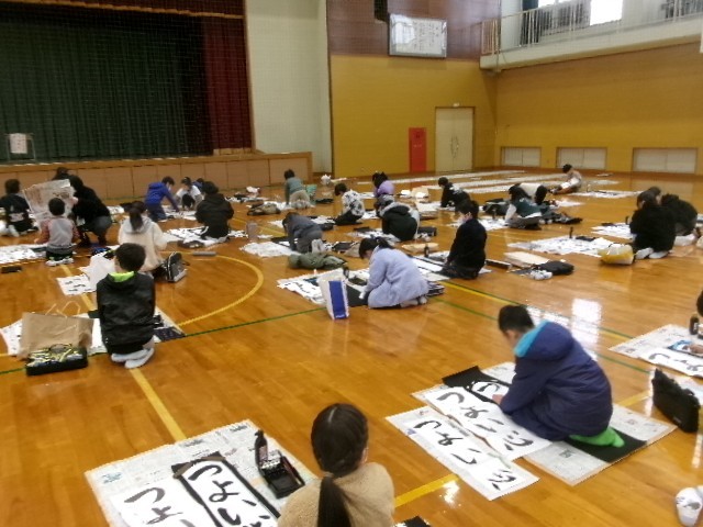 今日は書き初め大会でした。初めての毛筆での書き初めでしたが、子供たちは練習の成果を発揮し、集中して取り組む姿が見られました。