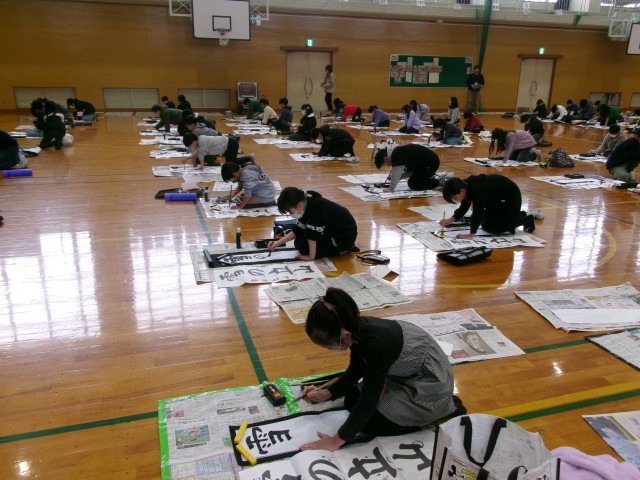 書き初め大会が行われました。子供たちは今までの練習の成果を発揮し、集中して書いていました。