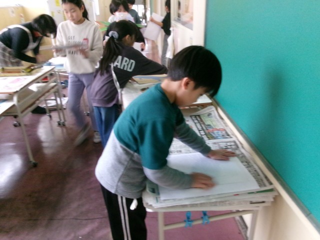 今日は、彫った板に好きな色のインクをつけ、紙に刷りました。