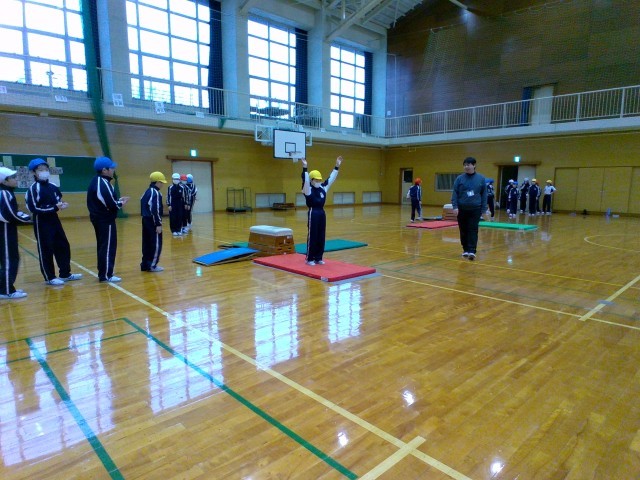 5年生の体育科の学習の様子です。準備体操に、学習発表会で行ったマット運動をやりました。アンテナの足の伸びがきれいでした。とびばこの踏切と着地を意識して練習しました。