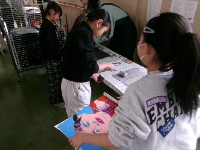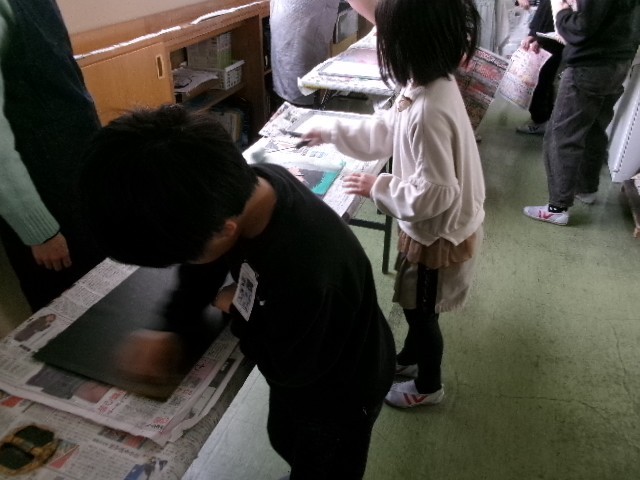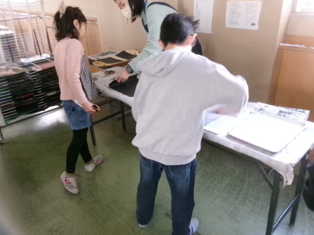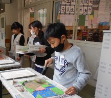 図工で、版画の印刷をしました。2枚に印刷を行い、その内の1枚はすべて自分で作業をしました。彫った跡や塗った色がきれいに出て嬉しそうでした。