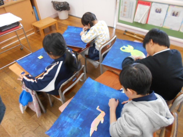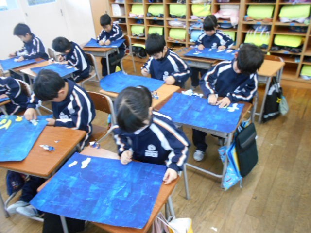 先週は、紙全体に紺色のインクを塗ったことで、「せっかくきれいな作品が…」と悲しんでいましたが、今日シールをはがすと、カラフルな形が浮かび上がってきました。みんなで楽しく、そっと破れないようにシールをはがしていました。
