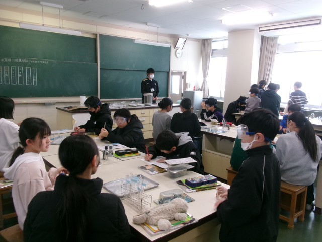 理科では、水溶液にとける金属について実験を行いました。どのような水溶液に反応するか予想しながら確かめました。