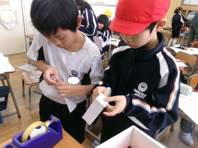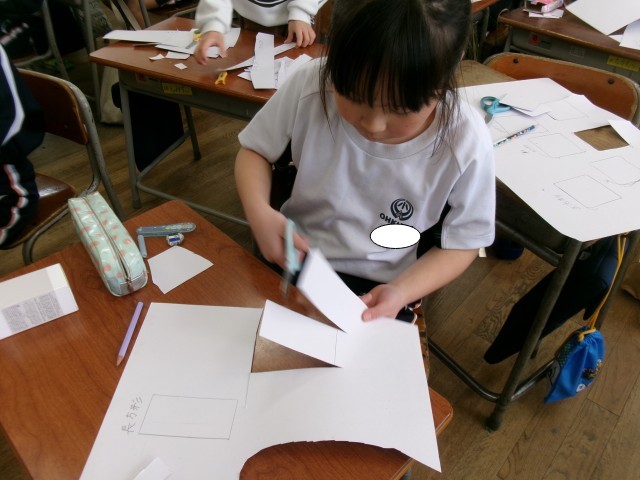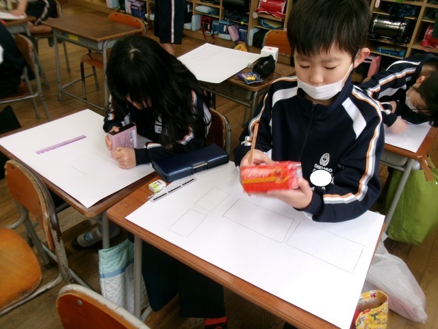 算数では、箱の形の学習に入りました。今日は、持ってきた箱を画用紙に写しとって、箱を作りました。写しとった四角形を見て、形や数のひみつに気付いていました。