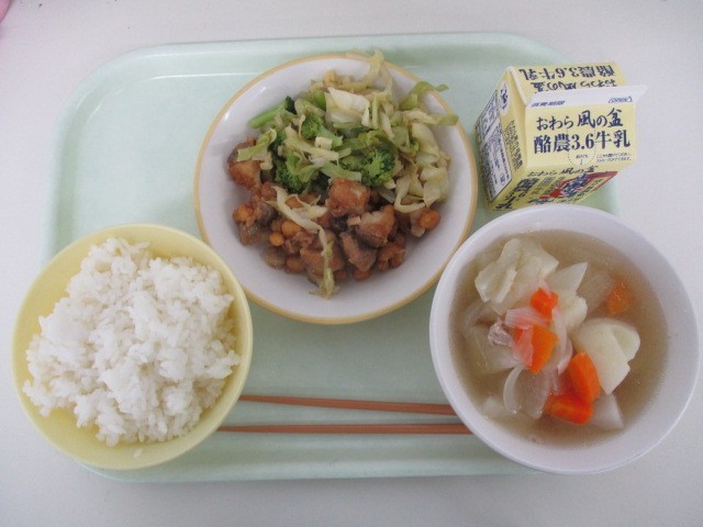 今日の献立は、 ご飯 ポトフ たらと大豆の甘辛目 グリーンサラダ 牛乳 でした。