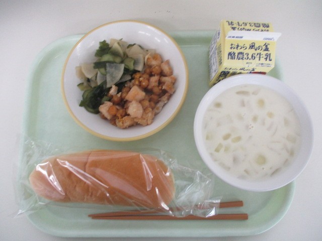 3月3日(月) 今日の給食 公開日 2025/03/03 更新日 2025/03/03 給食室から 今日の献立は、コッペパン 鶏肉と豆のハニーマスタードからめ クリームスープ 大根サラダ 牛乳 でした。