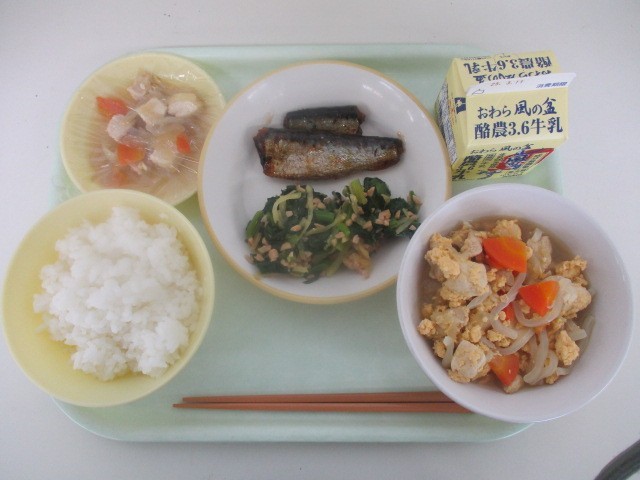 今日の献立は、ご飯 卵とじ いわしの土佐煮 納豆和え 牛乳 でした。