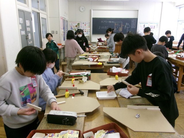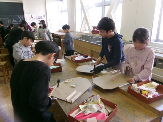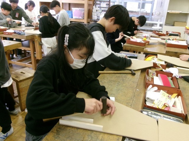 図工では、金づちを使って釘打ちをしています。各自、工夫して思い思いのコースを作成していました。