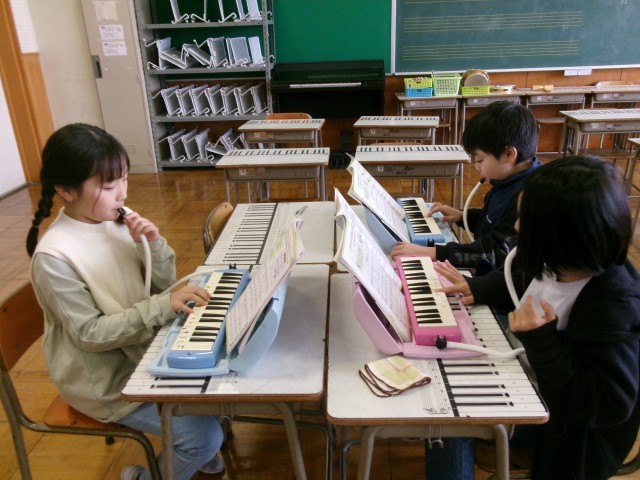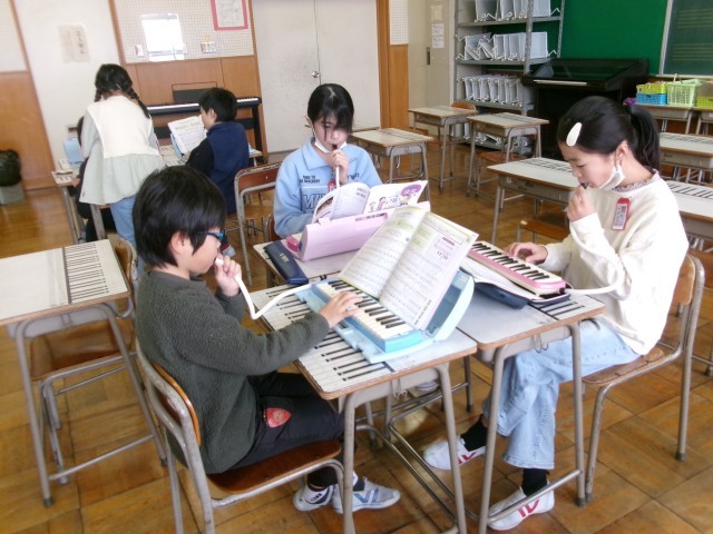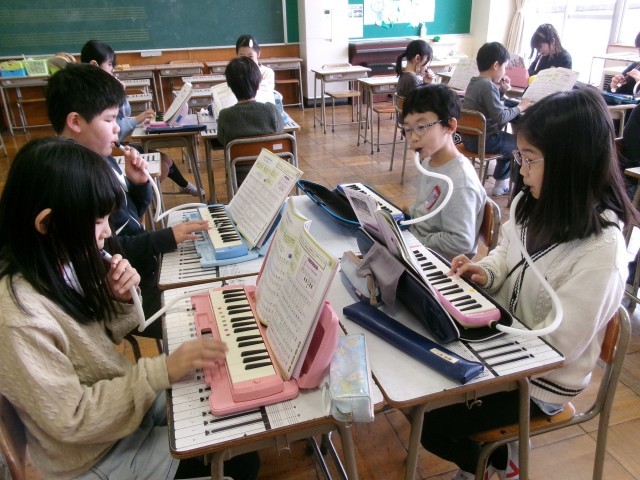 音楽では、「茶色の小びん」を班で演奏しています。次回は、鍵盤ハーモニカとリコーダーに分かれて二部合奏する予定です。