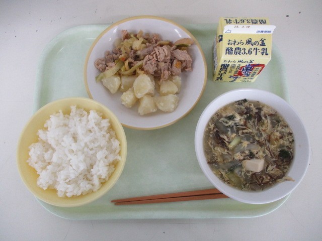 今日の献立は、 ご飯  豚肉とキムチ炒め  たまごともずくのスープ  こふきいも  牛乳  でした。