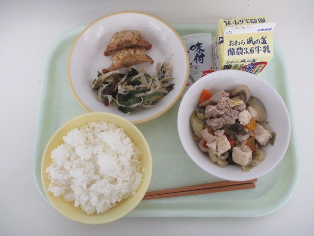 今日から1年生の給食もスタートしました。献立は、ご飯  肉豆腐  揚げ餃子  海藻サラダ  味付け小魚  牛乳  でした。
