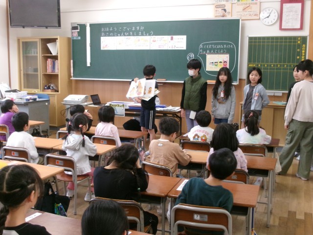 先週から引き続き、1年生の朝準備のサポートをしています。準備を早く終わらせ、紙芝居を読み聞かせしてくれているクラスもありました。