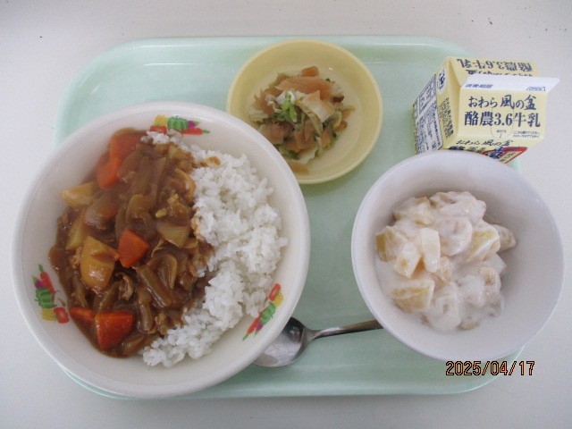 4月17日(木) 今日の給食 公開日 2025/04/17 更新日 2025/04/17 給食室から 今日の献立は、子供たちの好きなカレーライス。ほとんど残職はありませんでした。その他に、福神和え フルーツヨーグルト 牛乳 でした。