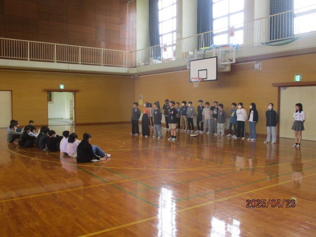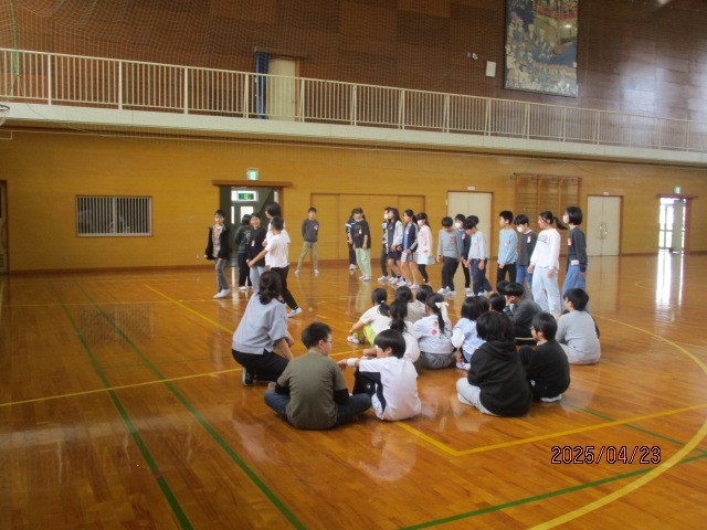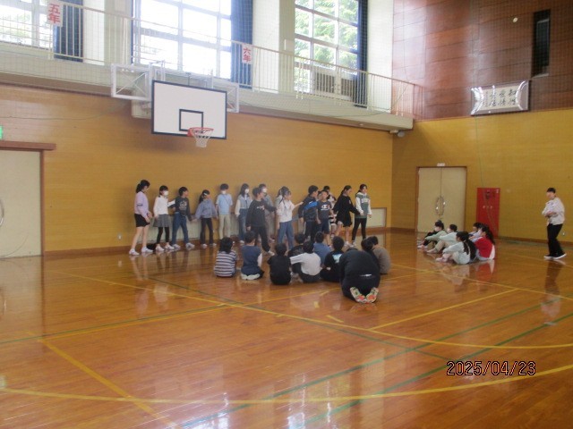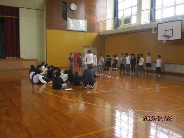 6年生から5年生へ、運動会で行う応援合戦に向けた伝達があり、エールや手拍子の仕方や、途中の演技の内容などが披露されました。