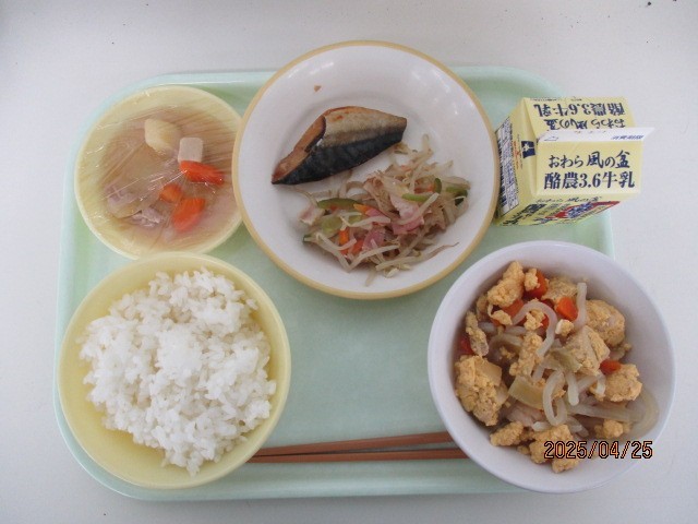 今日の献立は、ご飯  卵とじ  鯖の味噌煮  野菜ソテー  牛乳  でした。