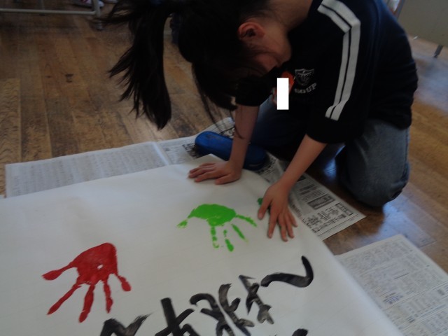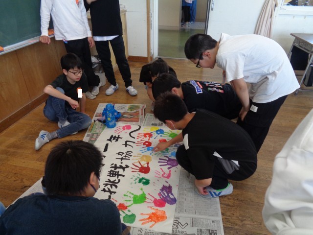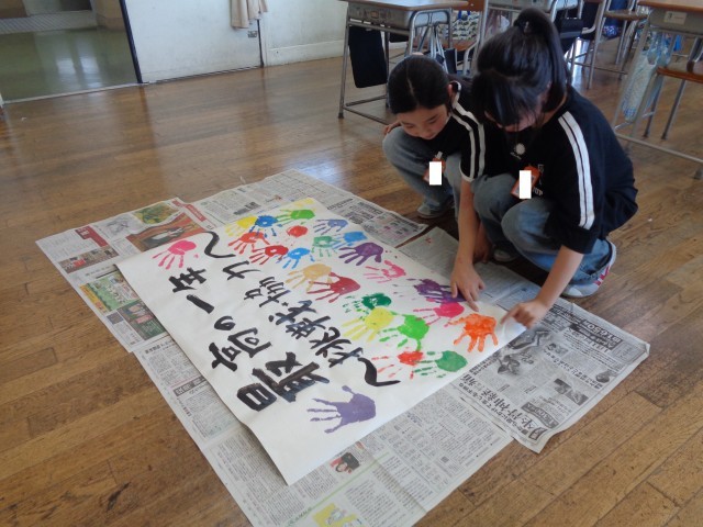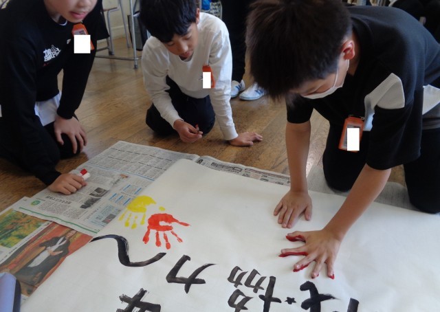 6年生の図画工作科の学習の様子です。学級目標の掲示を考え、一人一人の手形を押しました。好きな色で個性を出し、文字の下に手形を配置することで、学級を支えようという思いを表現しました。落ち着いた雰囲気の中に楽しそうな声が聞こえました。