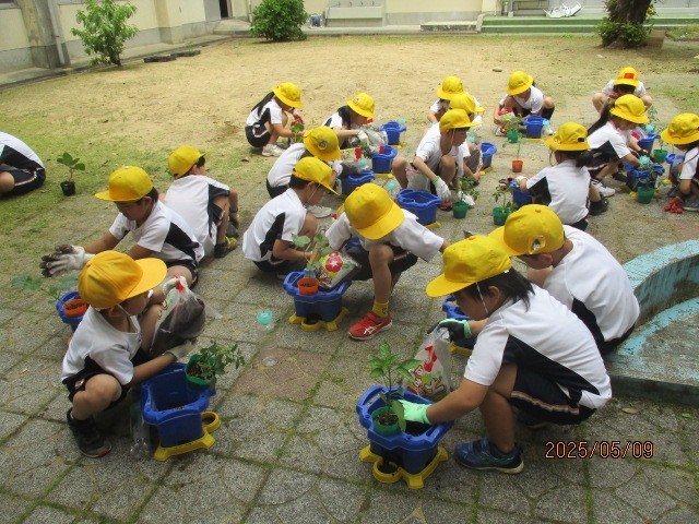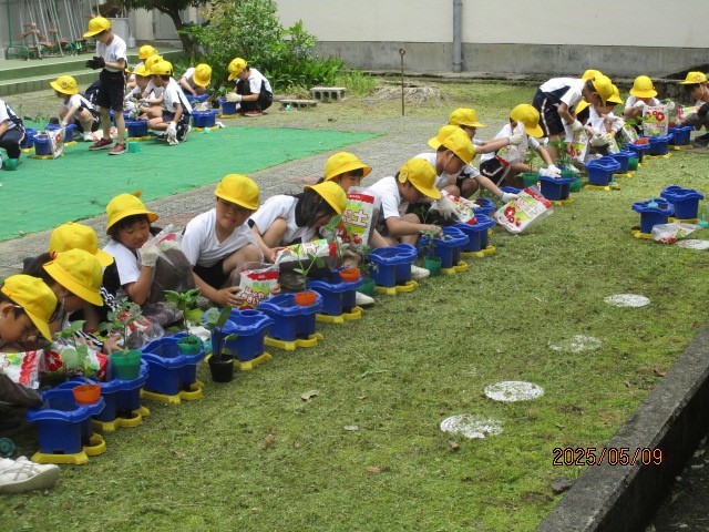 先日、JAで一人一人が購入した野菜の苗を、自分の鉢に植え替えました。たくさん収穫できるよう、心を込めてお世話をします。