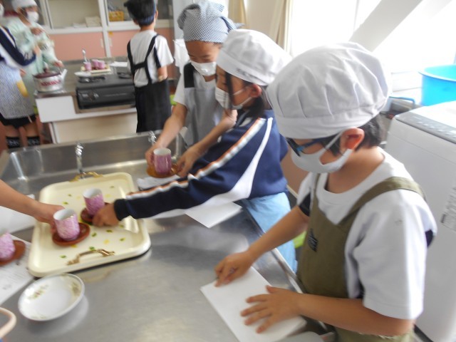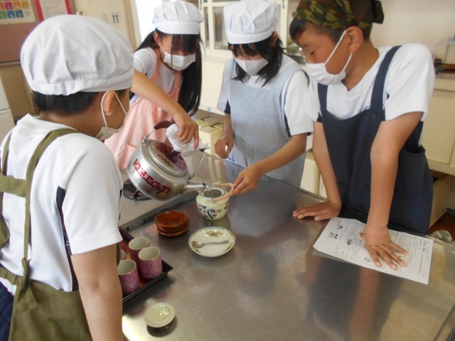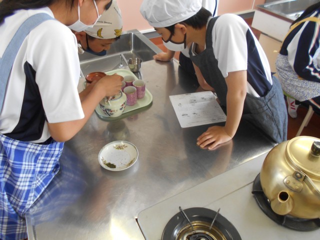 本日は、家庭科の授業で茶葉からお茶を作る実習を行いました。子供たちはグループ間で協力しながら、きゅうすを使って茶碗にお茶を淹れていました。お茶を飲んでいる時は「緑茶はあまり飲んだことはないけどおいしい」と嬉しそうに話していました。