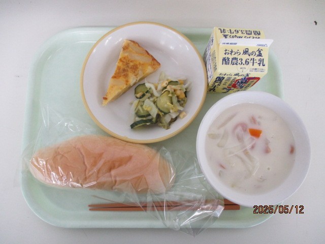 今日の献立は、コッペパン クリームスープ スパニッシュオムレツ コーンサラダ 牛乳 でした。