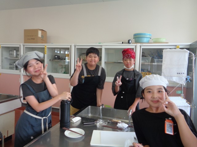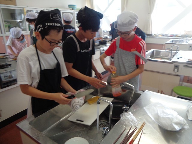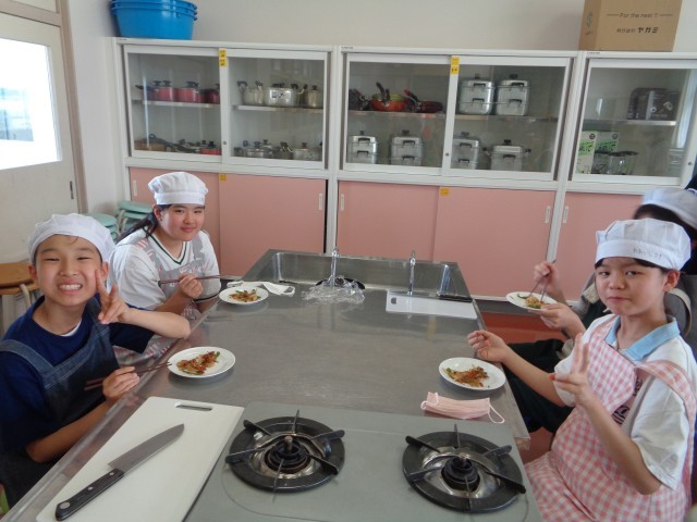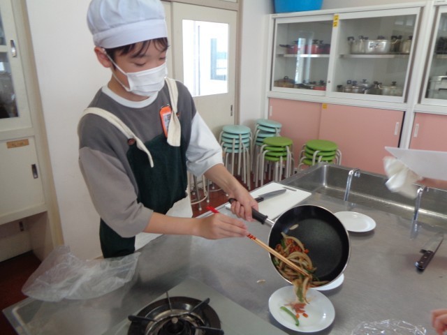 6年生の家庭科の学習の様子です。仲間と協力して、いろどり野菜炒めを作りました。生活班の仲間と役割を分担したり、盛りつけや調理道具を洗っているときに食べるためのいすを出したりしました。「おいしい!」や「優しい味がするから、もう少し塩こしょうふろう」という声が聞こえてきました。