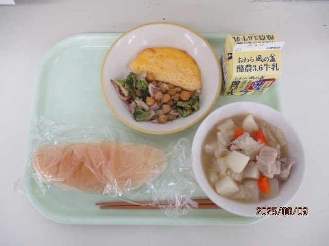 今日の献立は、コッペパン ポトフ きのこと豆のアヒージョ オムレツ 牛乳 でした。