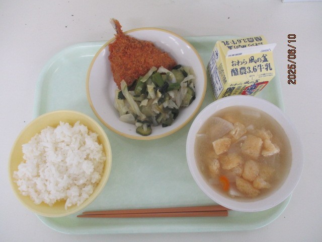 今日の献立は、ご飯 あじフライ みそ汁 海藻サラダ 牛乳 でした。