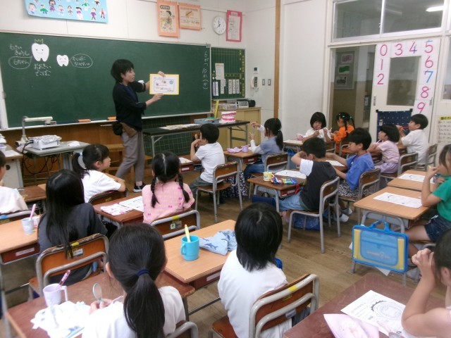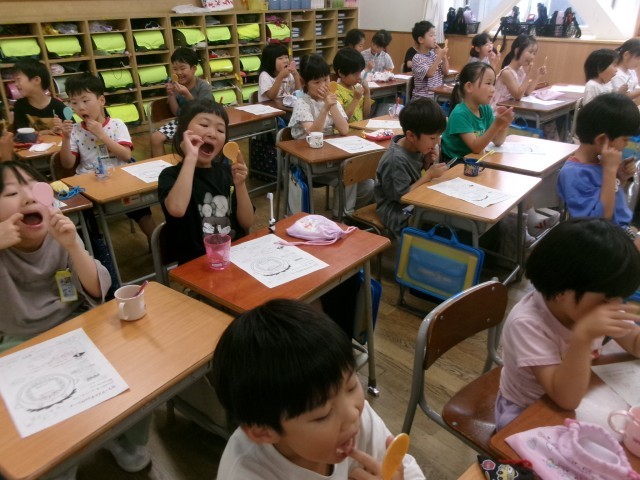 1年生 歯磨き指導 公開日 2025/06/12 更新日 2025/06/11 1年生 養護教諭の先生と歯の学習を行いました。歯磨きの仕方を教わり、給食が終わった後は習ったことに気をつけて歯を磨いていました。