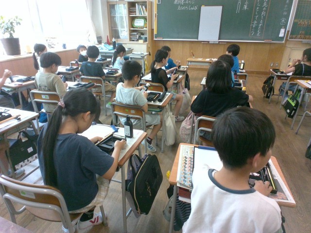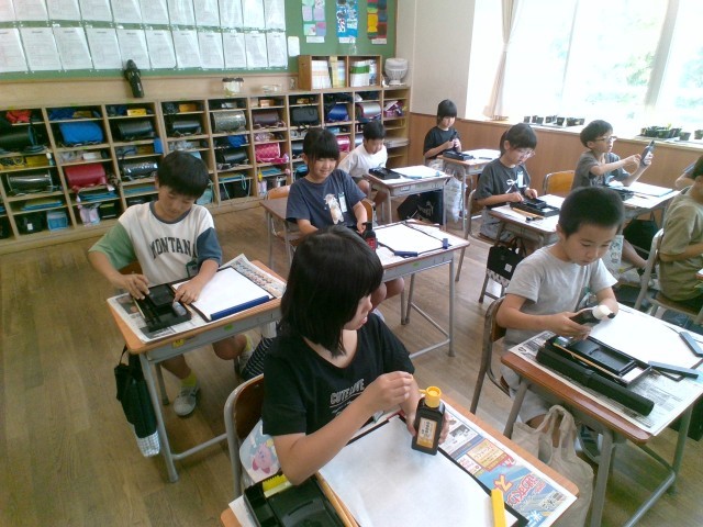今日の5時間目に書写の学習をしました。穂先の向きを意識しながら半紙に細い線や太い線を書きました。