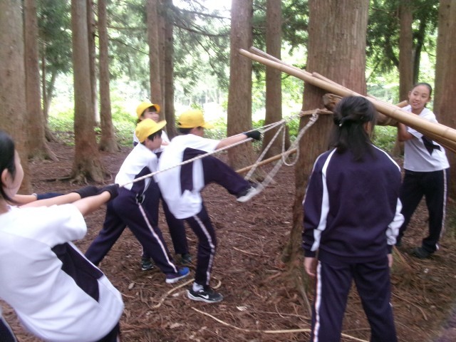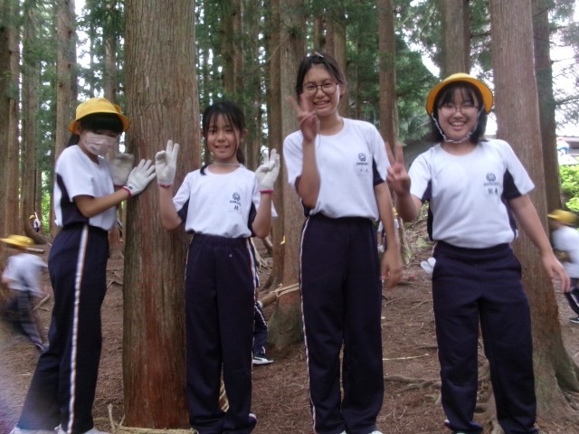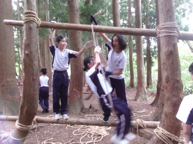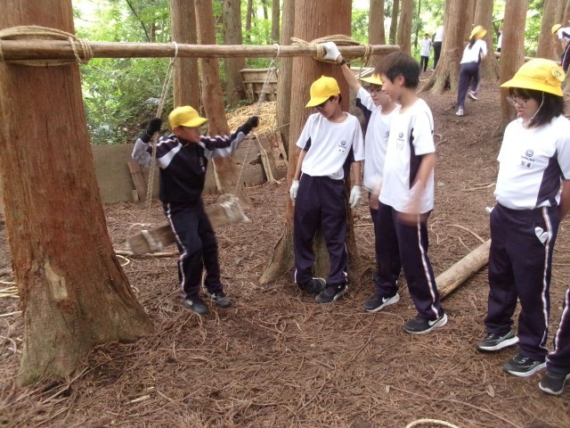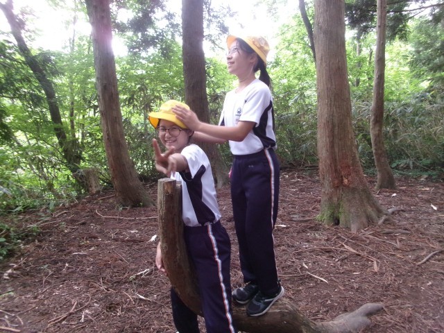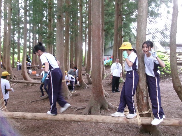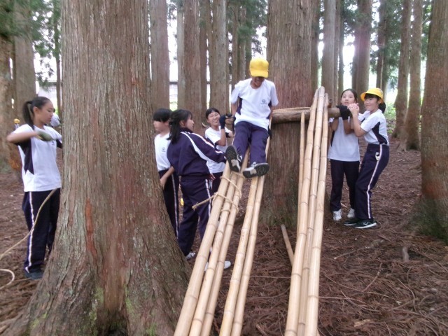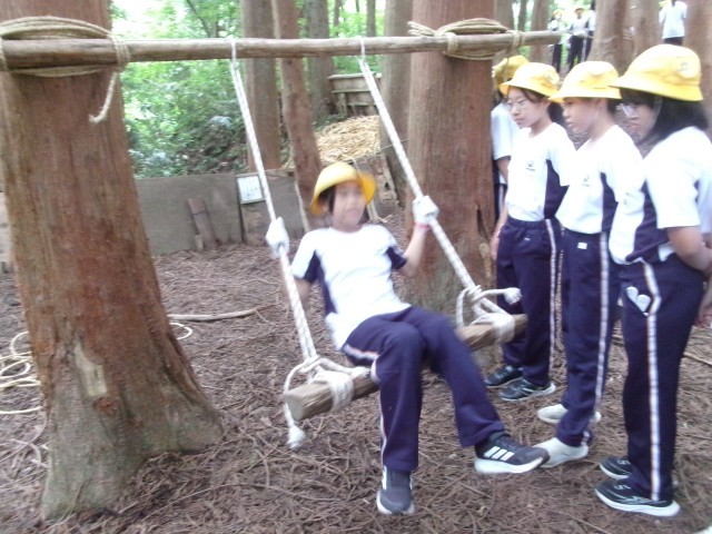 6月19日(木) 6年生 宿泊学習 森の遊び場作り2 公開日 2025/06/23 更新日 2025/06/22 6年生 丸太や竹、ロープなどを使い、工夫して遊具を作っています。写真は、すべり台や平均台、ブランコ、ターザンロープを楽しんでいる様子です。森の中は子供たちの楽しそうな声であふれていました。 +5