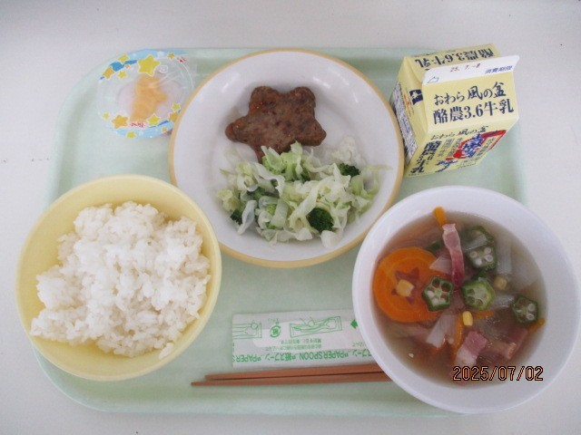 7月2日(水) 今日の給食 公開日 2025/07/02 更新日 2025/07/02 給食室から 今日は七夕献立でした。メニューは、 ご飯 星形ハンバーグ 天の川スープ 添え野菜 七夕ゼリー 牛乳 でした。