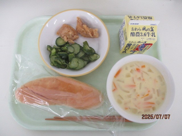 今日の献立は、コッペパン フライドチキン コーンポタージュ アスパラサラダ 牛乳 でした。