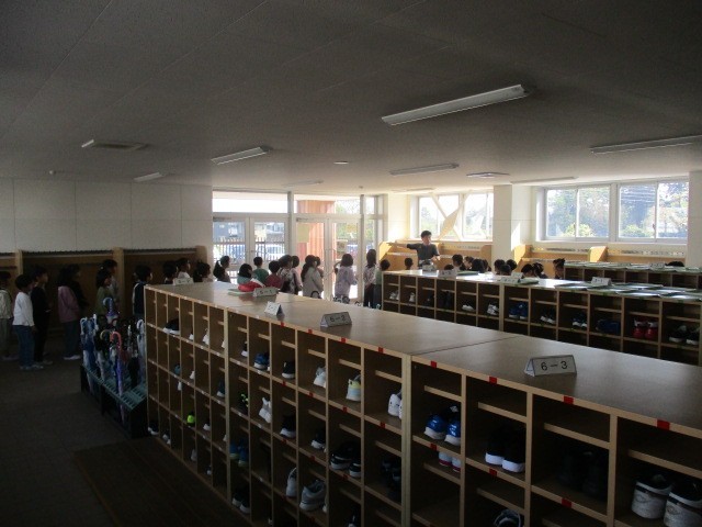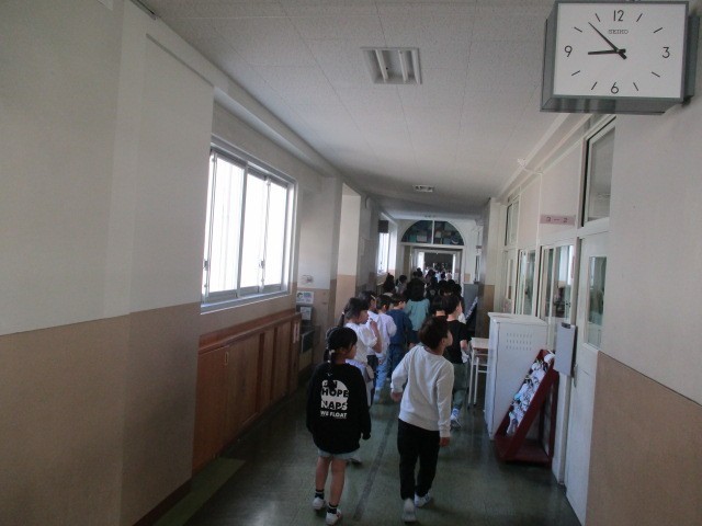 今日は、避難訓練お日です。各クラスごとに避難の仕方や避難場所、並び方等を確認します。2年1組と2組は、合同で1時間目に避難訓練をしていました。気を付けることや避難経路等を確認していました。