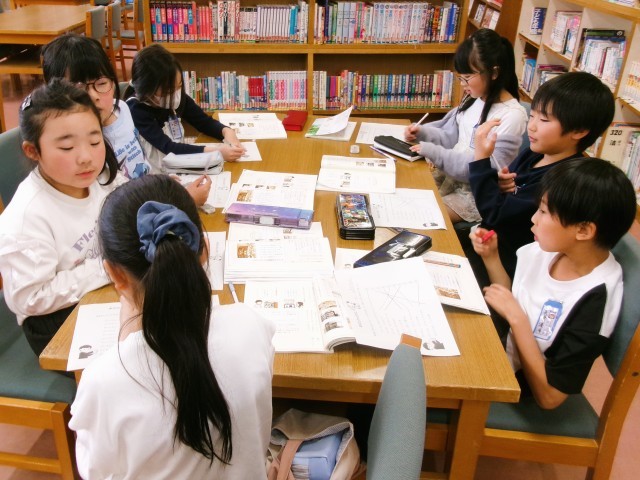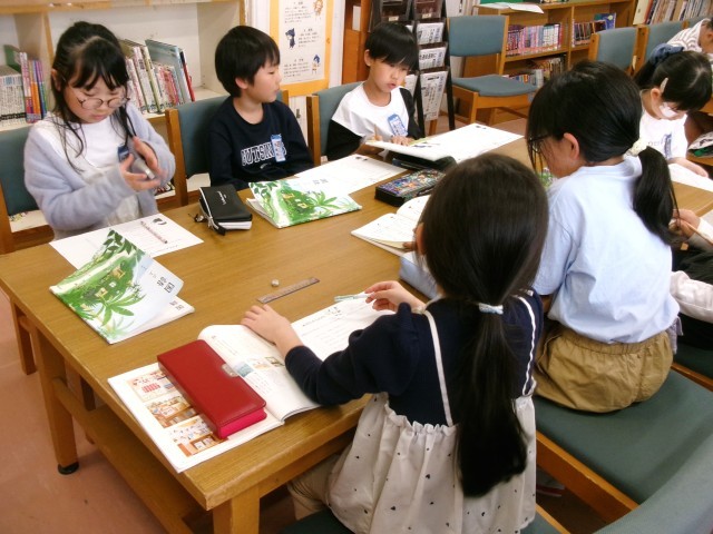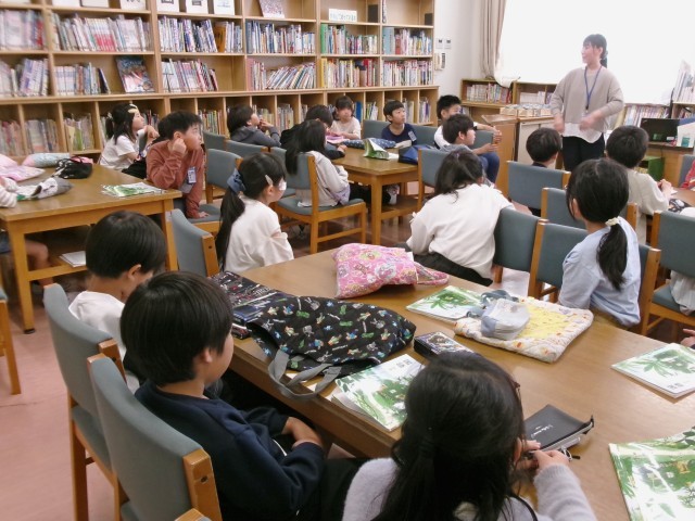 4限は図書室のオリエンテーションでした。司書の先生と一緒に図書室内の本の場所をクイズ形式で確認しました。本を借りるのが楽しみですね。