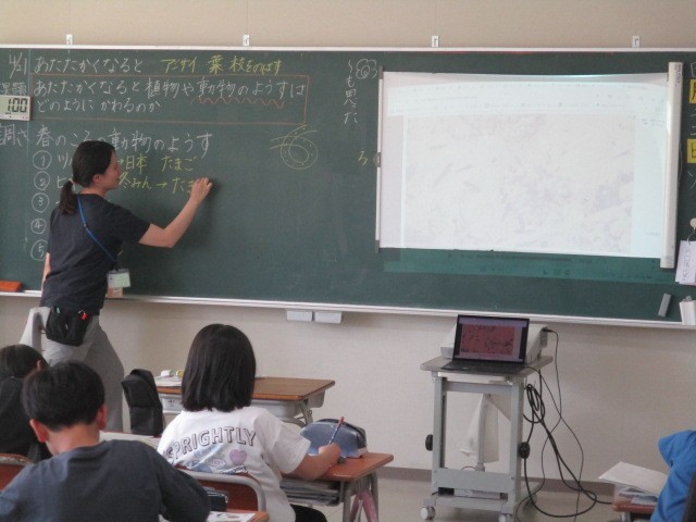 4年1組の3時間目は、理科の学習でした。あたたかくなると出てくる生きものについて話し合っていました。
