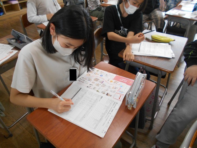 5年3組の家庭科の学習の様子です。家庭の仕事について、家族に頼りすぎていることに気付き、自分ができることを考えました。