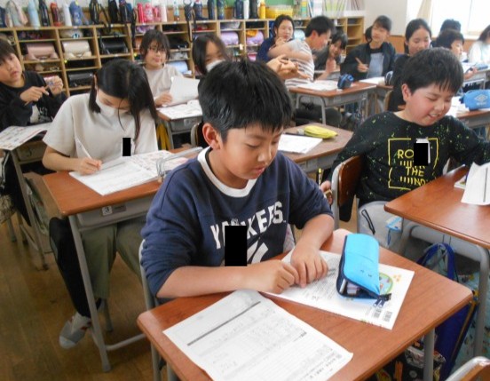 5年3組の1時間目は、外国語科の学習でした。自分の名前を英語でかいていました。