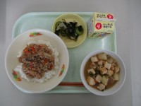 「学びをぱくり1おいしい教科書」献立2日目。今日は「国語」をテーマとした献立です。メニューは、スイミー丼 大きなかぶの煮物 海のサラダ 牛乳 です。